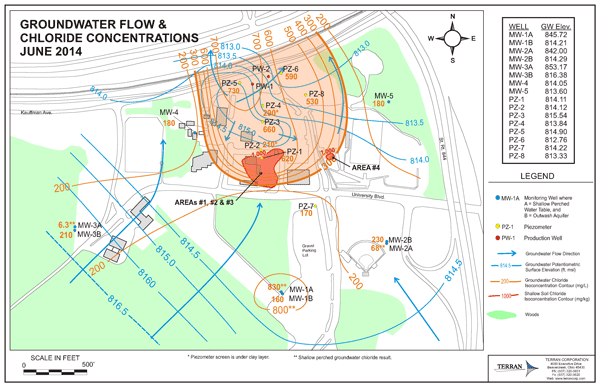 Map showing road salt source area, chloride contamination and groundwater flow.