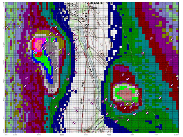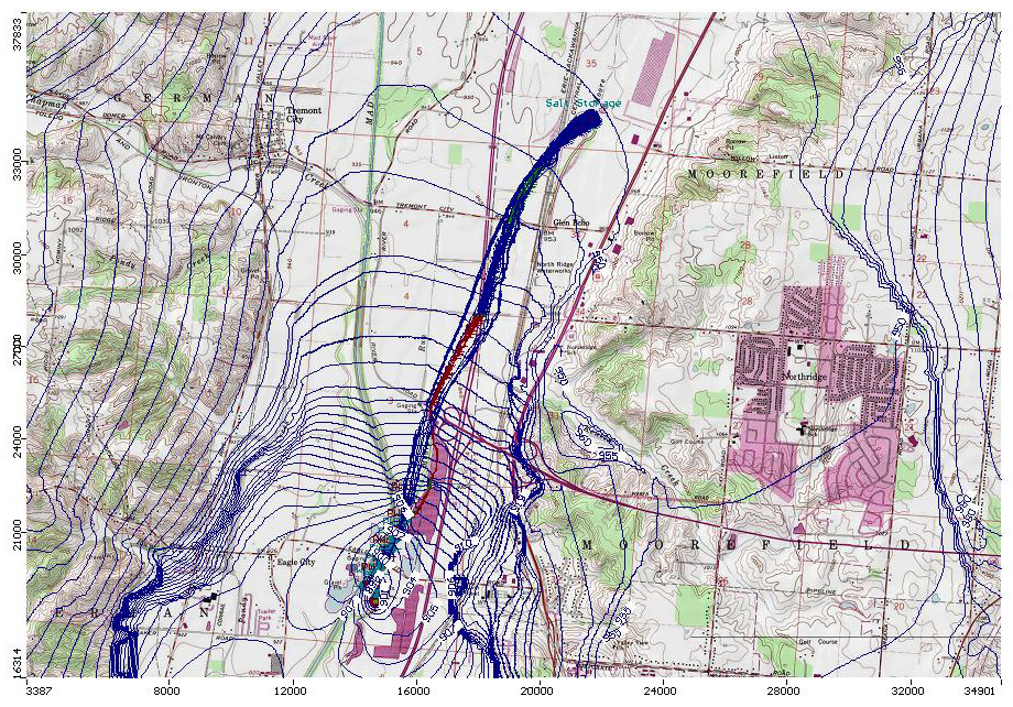 Groundwater Modeling: Terran has modeled the fate and transport of the chloride anion in groundwater for purposes of impact evaluation to receptors caused by salt-borne contamination. Fate and transport modeling provides desktop tools to evaluate natural attenuation, potential impact to receptors, and remedial measures design and time-of-completion estimates. Fate and transport modeling evaluate the concentration, longevity and destination of chemical contaminants in a groundwater flow system, including factors such as source loading, dilution, retardation, chemical degradation and other factors that influence the rate, concentration and extent of contaminants in groundwater.
